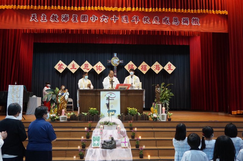 今年是天主教海星國小創校六十週年慶,學校在校長吳煒增帶領下舉行系列慶祝活動。學校上週五舉行校慶感恩彌撒,由天主教花蓮教區大家長黃兆明主教主禮,創校的聖吳甦樂羅馬聯合女修會的三位修女,以及聖瑪爾大女修會的三位修女參與,還有前兩任海小校長黃歐菊芬,及海星中學校長孔令堅共同祝賀,讓彌撒現場增添溫馨與共融,部分神父雖然無法蒞臨參與,他們也在祈禱中共同為海小祝福。