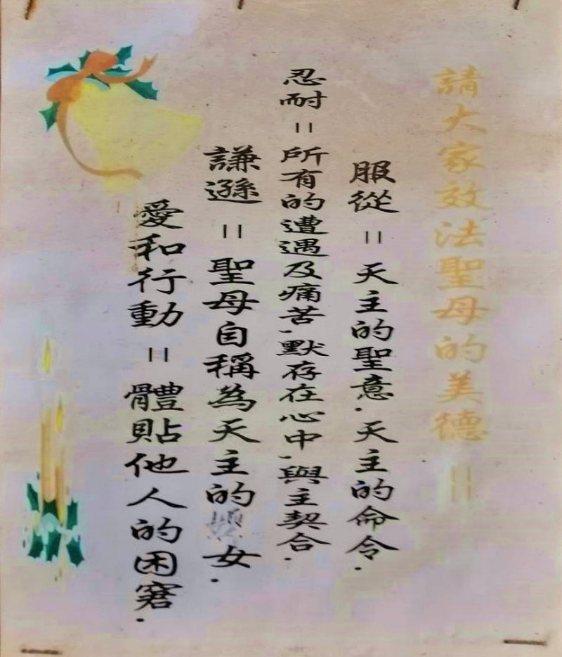 彌撒中的聖道禮儀,神父也講過聖母的由來,神父希望加爾默羅的母聖軍能夠像聖母領報一樣—「主之婢女在此」。希望聖母軍的弟兄姐妹常默存這句話在心中,學習聖母一樣服從天主的聖意。能學習忍耐:所有的遭遇及痛苦,默存在心中,與主契合。能學習謙遜:聖母自稱天主的婢女,愛和行動,體貼他人的困難。
