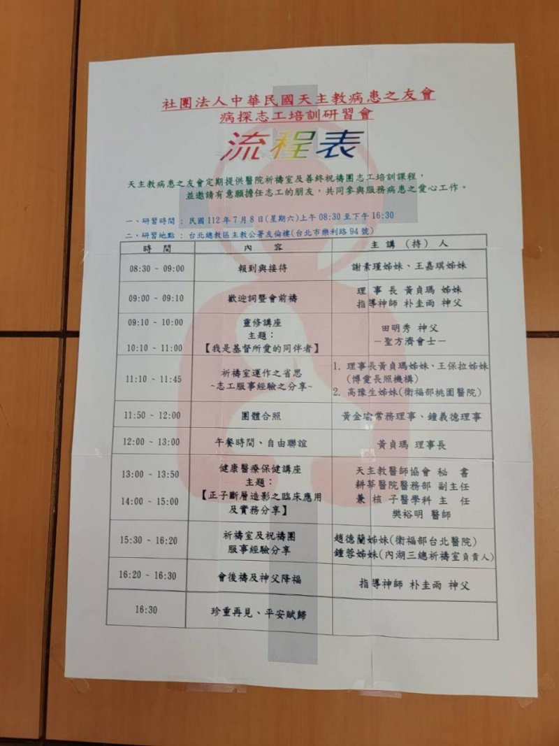 112 年 7 月 8 日(六)上午 8 時 30 分至下午 16 時 30 分,於台北總教區主教公署(台北市樂利路 94 號)友倫樓辦理,收到這個上課資訊是由聖彌額爾銅門天主堂范竣會長轉知,並協助報名,才有福氣能上這樣的特別的課程。感謝讚美天主!
