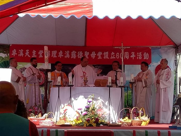 【花東教聞編輯組】卓溪露德聖母堂開教 60 周年慶, 2 月 16 日以「福傳」為精神主軸舉行慶祝典禮,花蓮教區黃兆明主教、玉里堂區劉一峰神父、陳春光副主教、林國璋秘書長、延平堂區蘇佐隆神父、瑞穗堂區林信良神父等人出席盛會,參與教友近千人,眾人歡慶本堂成立一甲子,場面隆重盛大。