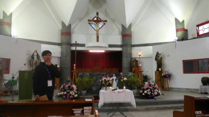 路程中,我們沒有休息,到了台東聖母農莊,有工作人員已經在那裏等待著我們。我們一起進聖堂入座,神父介紹教堂的由來,尤其聖體龕是一位教友在海邊撿到的,有一日神父到教友家裡拜訪,看到聖體龕,才由教友口中得知這一段的由來,便把它奉獻給教堂。