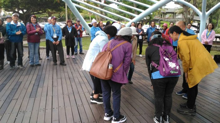 我們吃完後回到活動中心,繼續我們的活動,神師安排大家手牽手,圍個圓圈牽手做遊戲,考驗團體的默契和培養我們團結一心。隨後我們玩的很開心,由第一、二名的人出來表演,逗的大家不亦樂乎。隨後,我們來到三仙台,大家合照後,神師要我們大家圍繞在圓環中,請活活動組帶動唱,活動中讓每個人身體力行、互動按摩,讓身體更放鬆、心情更愉快。因為時間的關係,在神師的降福中,我們互祝平安,懷著好心情回到溫暖的家。